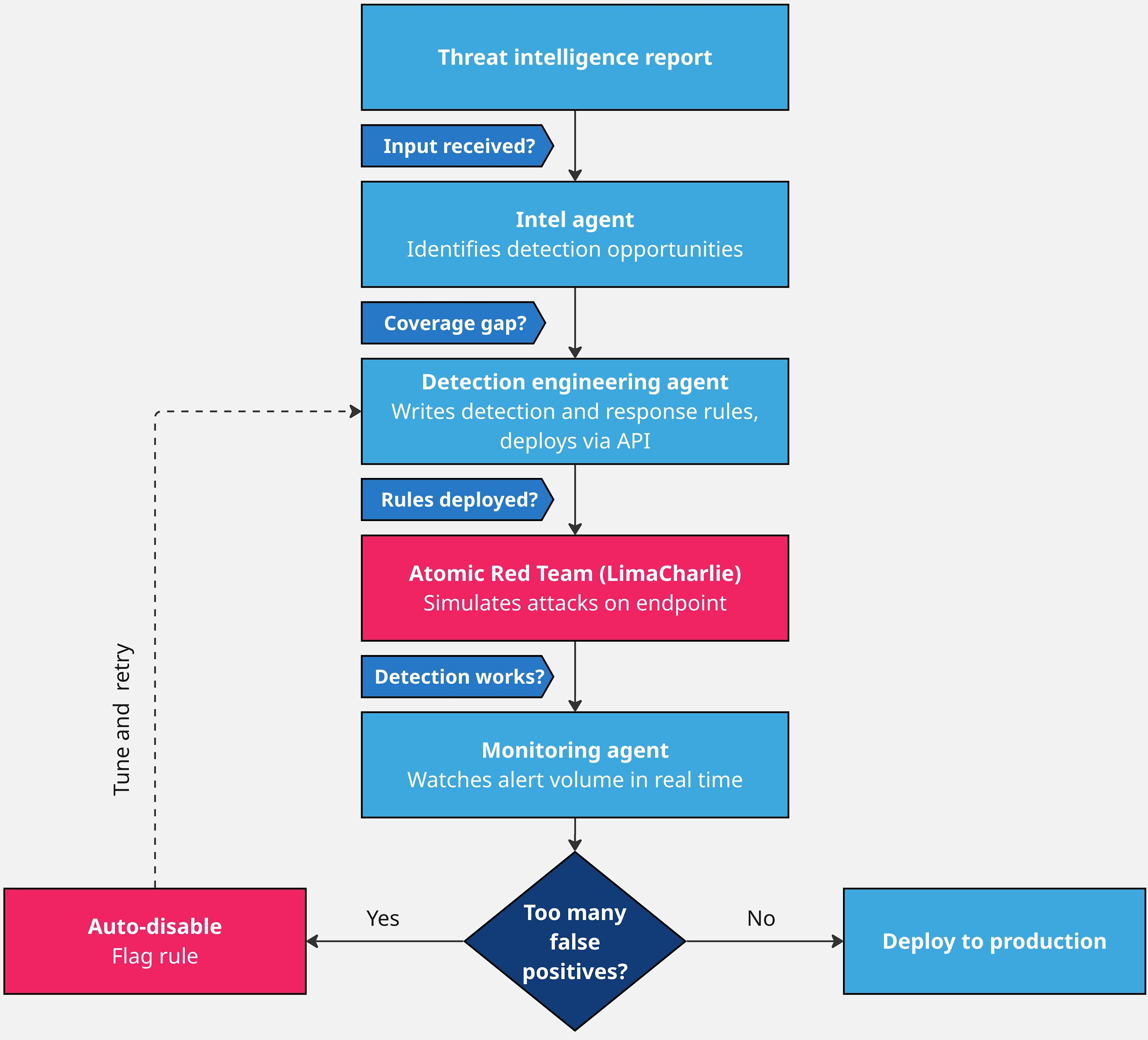 An agentic detection engineering pipeline compresses this cycle significantly. A threat intelligence report that once took hours to convert into tested, deployed detection logic now moves through the pipeline in a fraction of the time.