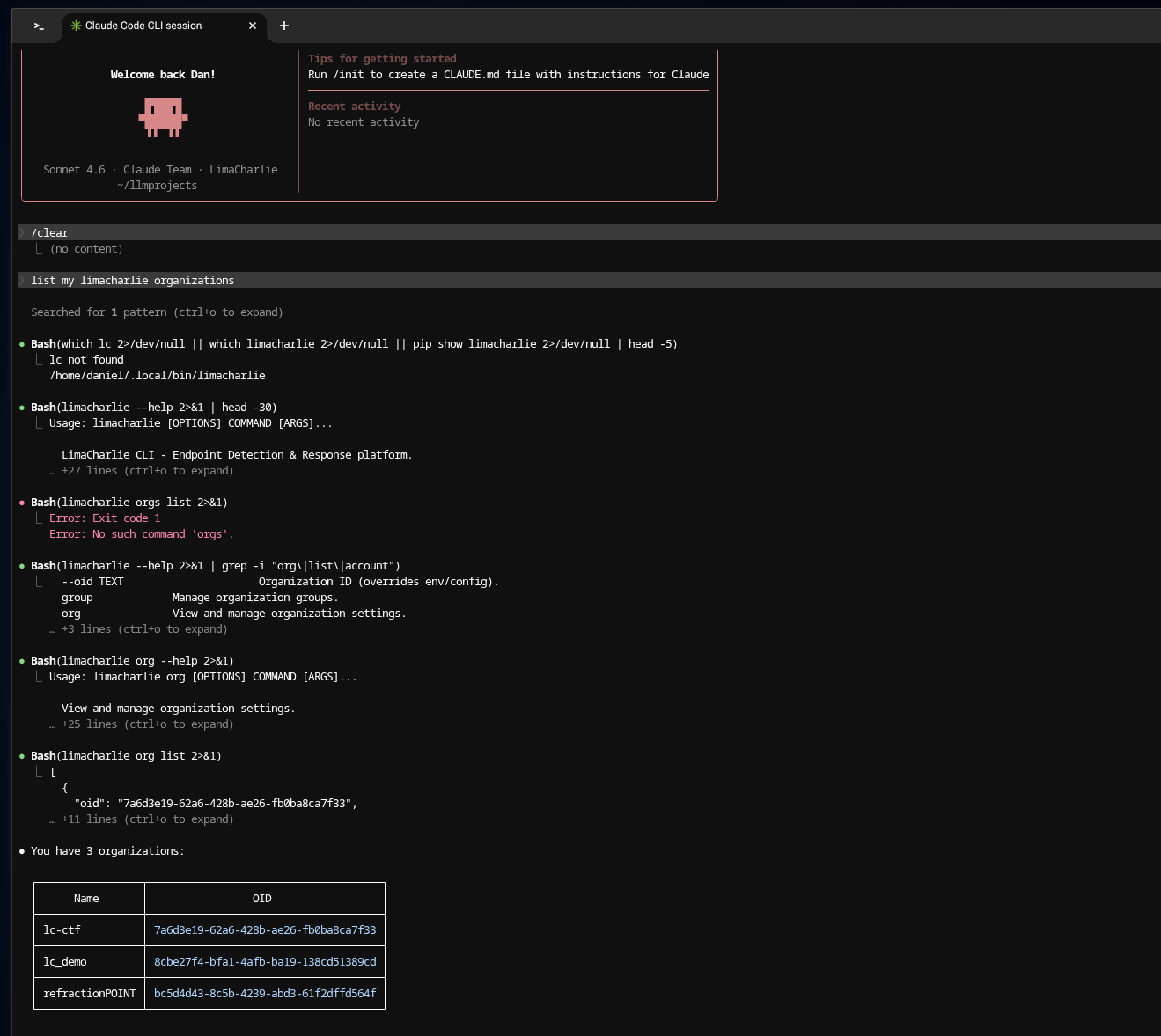 Integrating Claude Code is what makes everything after account creation fast. The LimaCharlie Claude Code plugin is installed with two short commands. Once Claude Code integrates with LimaCharlie you have a SOC that can be built, structured and controlled through conversational prompts.
