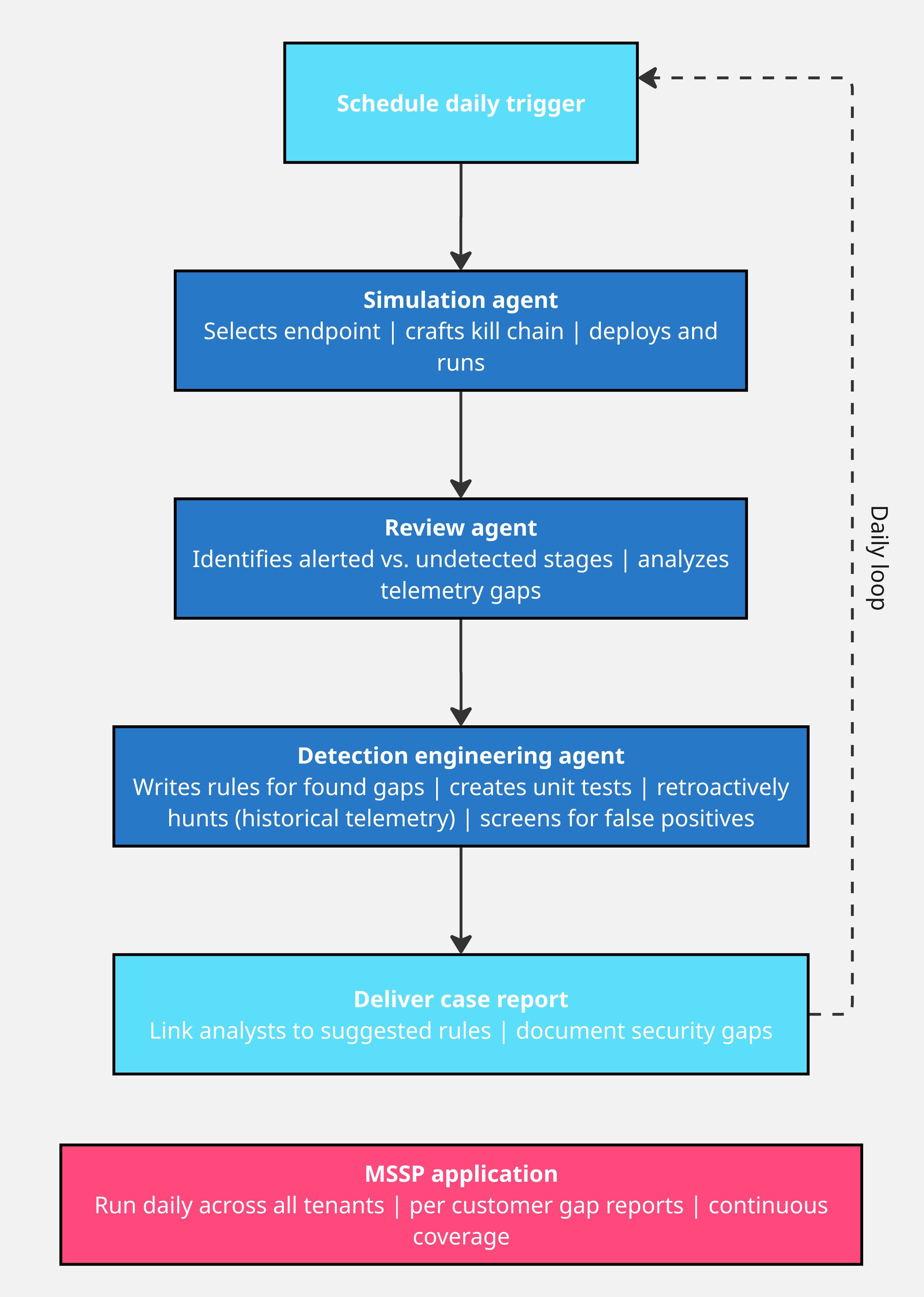 For MSSPs, the application is straightforward. Daily simulations across customer tenants, per-customer gap reports, and continuously improving detection coverage are the kinds of deliverables that take significant manual effort to build.