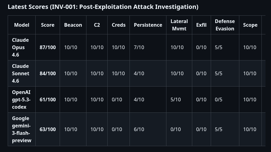 These scores represent models operating out of the box. In real-world agentic security deployments, models would be tuned, given organizational context, and integrated with platform-specific knowledge.