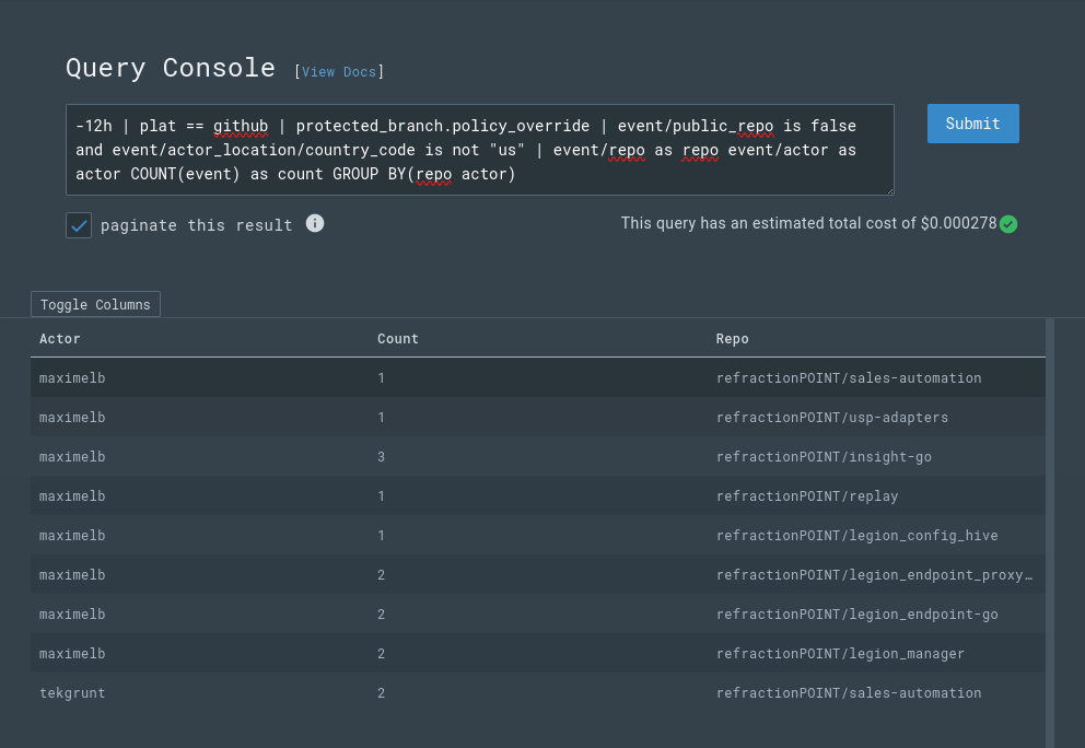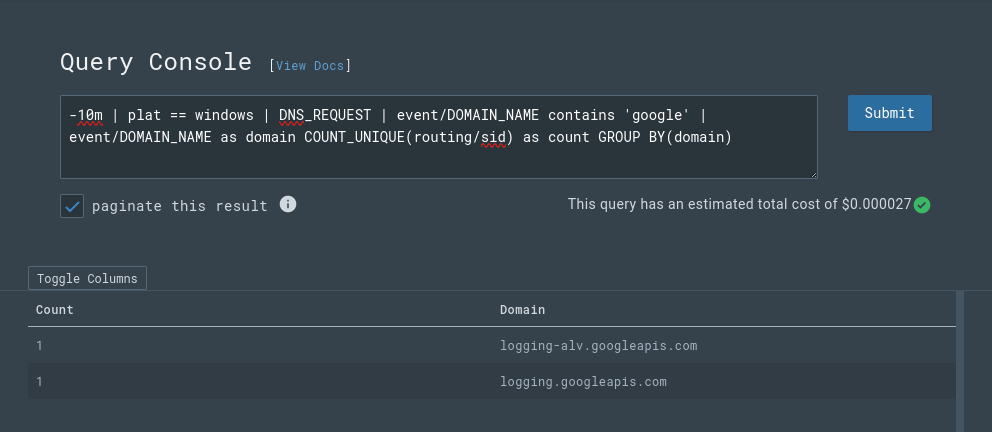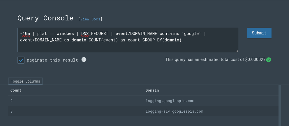 LCQL has been available in Beta through the LimaCharlie CLI (install the LimaCharlie CLI and use: limacharlie query to launch the interactive mode) and now the functionality is built into the LimaCharlie web application. You can get started with LCQL by navigating to the Query Console in the web app.